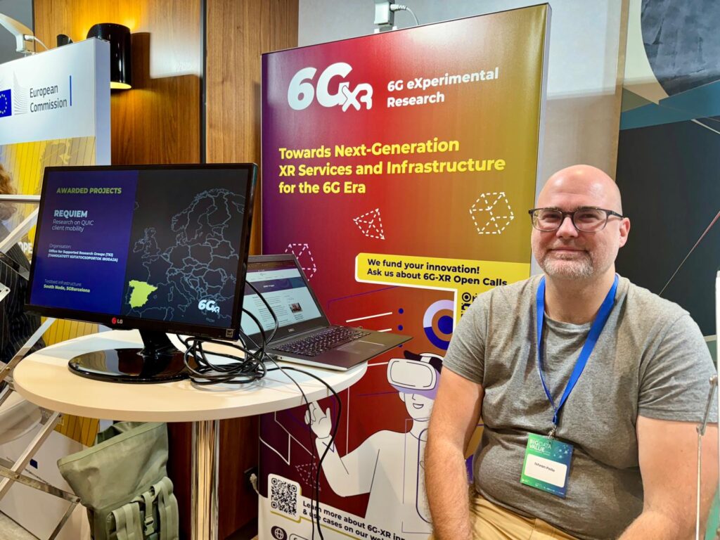 6G-XR further engaged conference attendees through its booth, which featured a live demo by one of the winners of the first wave of open calls Research on QUIC client mobility (REQUIEM) project, executed by Office for Supported Research Groups (TKI – TAMOGATOTT KUTATOCSOPORTOK IRODAJA) from Hungary. The demo, represented by the team of Felicián Nemeth, Lévai Tamás and Istvan Pelle, showcased practical applications of the project’s technologies, drawing considerable interest from conference participants. This interactive setup allowed visitors to see firsthand the tangible outcomes of 6G-XR’s support for innovation to third parties.
